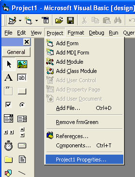 From the dropdown menu under "Project" select the bottom menu item. It will have the name of your current VB project followed by the word "Properties". A Project Properties dialog box will appear.