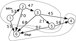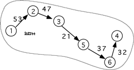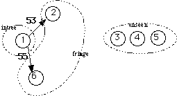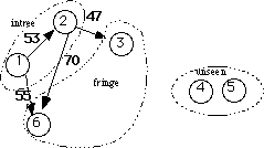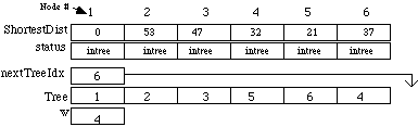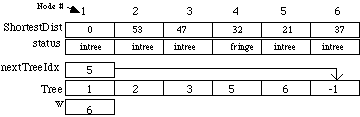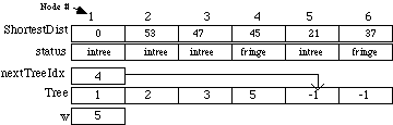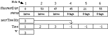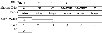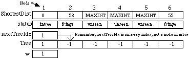 ShortestDist is the shortest distance from a node in the tree to the one in the fringe. MAXINT is a large constant used to indicate that nodes 3, 4, and 5 cannot be reached by any node in the tree. The array status holds an enumerated data type value indicating whether each node has been added to the tree (intree), or is adjacent to a node that is in the tree (fringe), or not (unseen). The integer nextTreetIdx is the index in the Tree array where the next node index will be stored. The integer w is the node currently being added to the tree. After this starting step node 1 has been added to the tree, nodes 2 and 6 are in the fringe, and nodes 3, 4, and 5 are unseen. In the next iteration node 2 will be added to the tree because 53 is less than 55. The results gives the following: