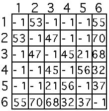 At this point there are no nodes remaining from the graph that have not been added to the tree. How can we implement this approach to solving the problem of Prim's algorithm? To keep things simple we will implement all of our graph as an adjacency matrix. A 2-D array will do the trick, thus: int adjMatrix[6][6]. A diagram of the matrix representing the graph is shown below.