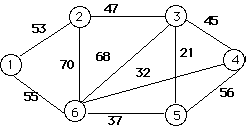 ShortestDist is the shortest distance from a node in the tree to the one in the fringe. MAXINT is a large constant used to indicate that nodes 3, 4, and 5 cannot be reached by any node in the tree. The array status holds an enumerated data type value indicating whether each node has been added to the tree (intree), or is adjacent to a node that is in the tree (fringe), or not (unseen). The integer nextTreetIdx is the index in the Tree array where the next node index will be stored. The integer w is the node currently being added to the tree. After this starting step node 1 has been added to the tree, nodes 2 and 6 are in the fringe, and nodes 3, 4, and 5 are unseen. In the next iteration node 2 will be added to the tree because 53 is less than 55. The results gives the following: